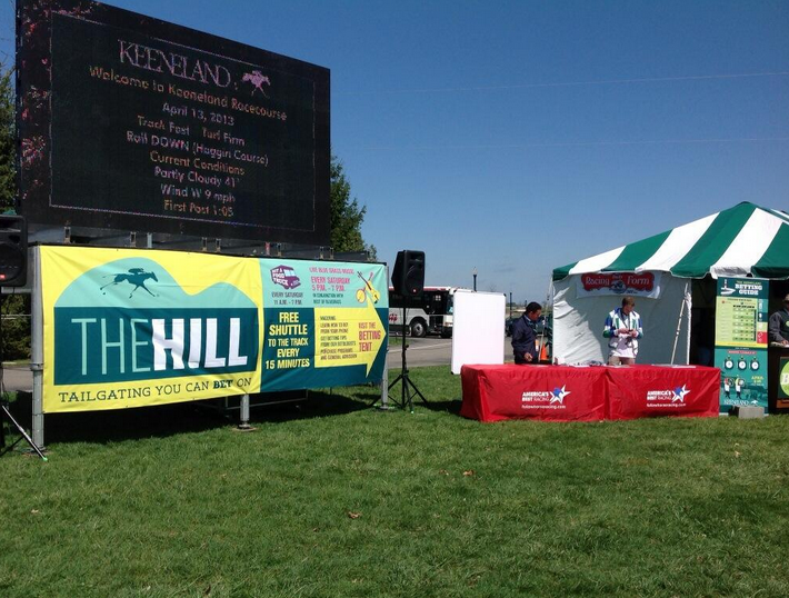 While I technically watched the race on the Keeneland grounds, my fellow America’s Best Racing Brand Ambassadors and I were physically about a half-mile from the actual race track at “The Hill,” Keeneland’s new tailgate experience. We parked the ABRV on top of the hill next to a huge jumbo tron, which stood next to a large betting tent. Beyond the betting tent was a portable restroom that was definitely more than a few steps above your average porta-potties. Along one side also sat various food trucks. Our team of ambassadors set up our tent outside of our bus where we signed people up for our Ultimate Kentucky Derby Sweepstakes and we also gave patrons lessons on reading a program and wagering 101.