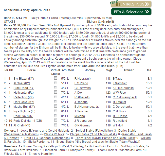 I will post some selections on Saturday, and don’t forget about the last day of Keeneland tomorrow, highlighted by the $150,000 Elkhorn Stakes, which I will post my selections for tomorrow: