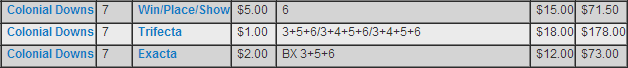 Magdalena Racing’s War Dancer captured the 16th running of the $500,000 Virginia Derby (G2) at Colonial Downs Saturday, going off at odds of 7-1. I had originally listed Charming Kitten as my pick for this race, but what I didn’t tell you is that I had a change of heart on this horse at the last minute. I put $5 across the board on War Dancer and also had the $2 Exacta box with War Dancer/Charming Kitten and the $1 trifecta box War Dancer/Charming Kitten/Jack Milton. So on three wagers I spent a total of $45, and got back a total of $322.50. Not bad for how I started on the day!