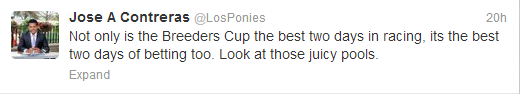 Speaking of horseplayer dreams, the Breeders’ Cup and NBC Sports came up with a crazy concept called Million Dollar Finish, where contestants sign up to pick the correct order of the top-10 finishers in the Breeders’ Cup Classic, for a chance to win $1,000,000. So there are 14 horses in the race – let’s do some quick math – 14x13x12x11x10x9x8x7x6x5 = over 3.6 Billion… but hey, this guy’s still going to take a crack at it! I don’t even know if I’m eligible to win, but who cares? It’s still fun!