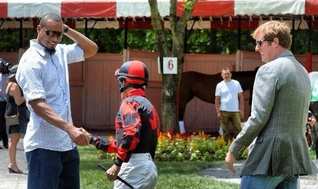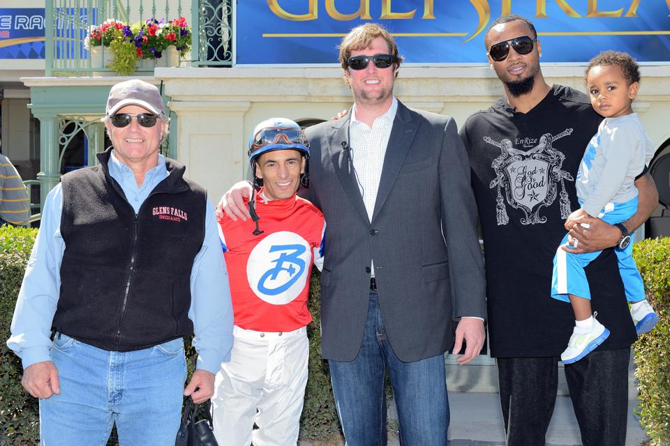From left to right: Trainer Bill Mott, Jockey John Velazquez, Jake Ballis, Rashard Lewis and son Rashard Jr.