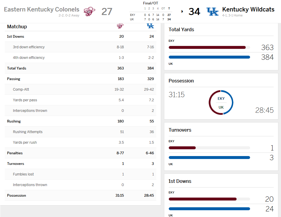 After failing to match Eastern Kentucky’s effort level for the first 53 minutes of Saturday’s game, Kentucky once again overcame adversity to pull out a close win, forcing the Colonels to overtime to take the eventual 34-27 victory.